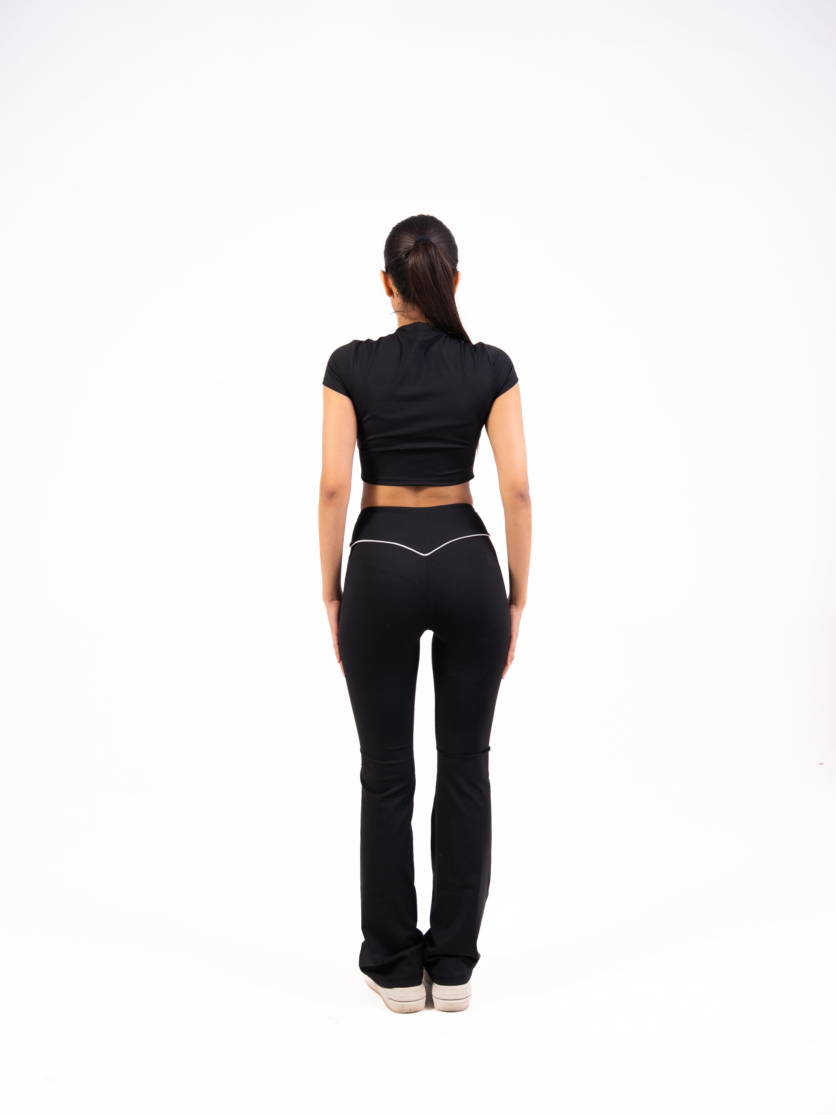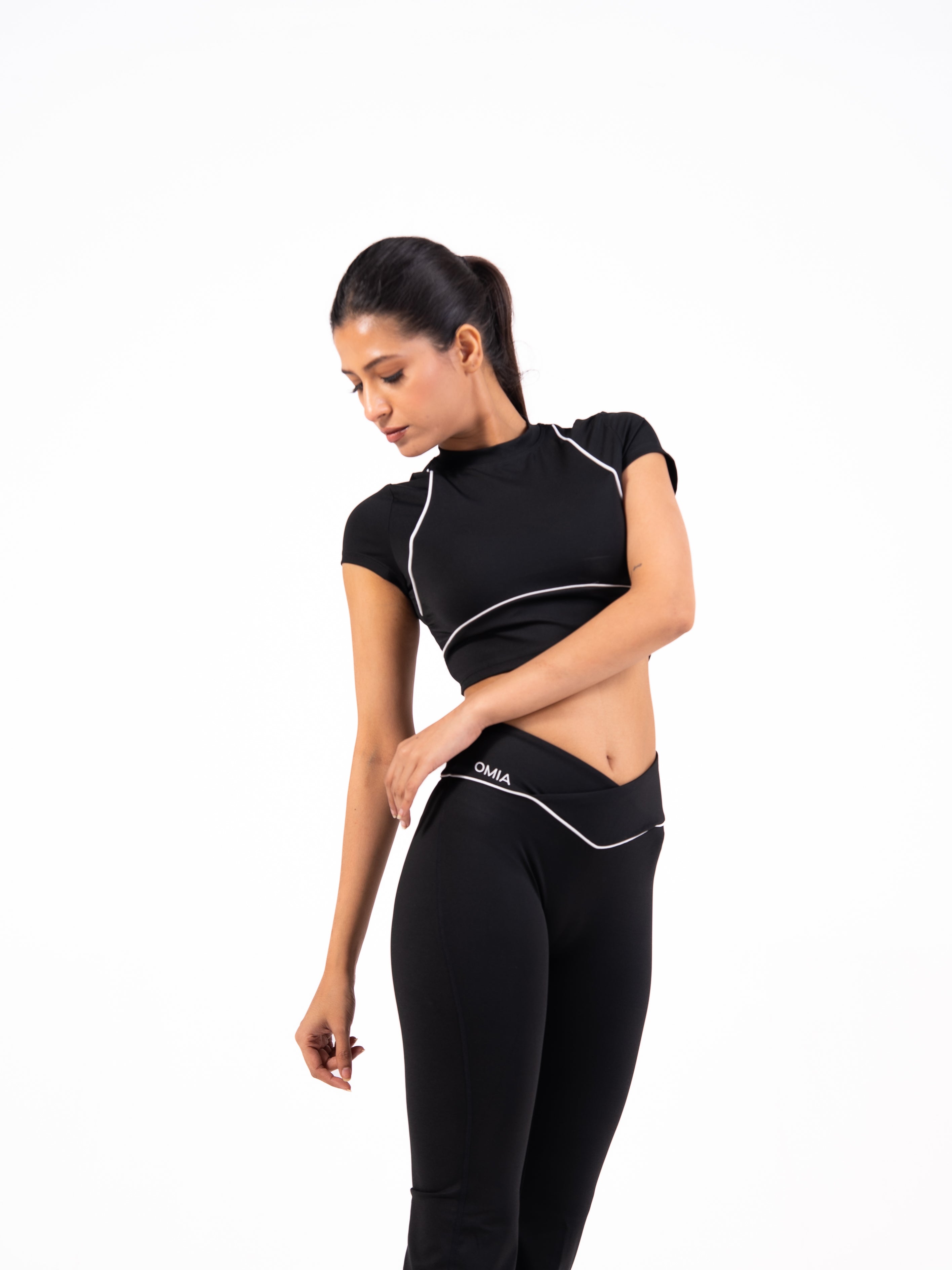 The sculpted crop top flatters every curve, while the high-rise flared pants elongate your frame with effortless sophistication. Designed with OMIA’s signature luxury stretch fabric and crafted from recycled spandex, it’s made to move with you — from reformer to rooftop.